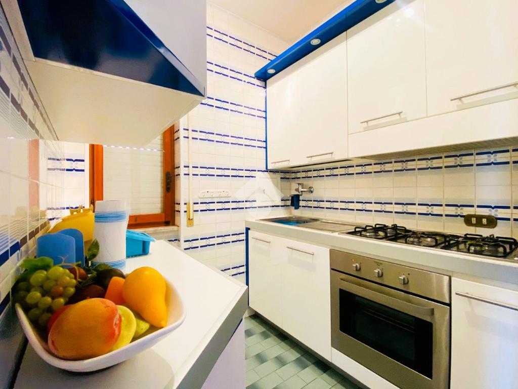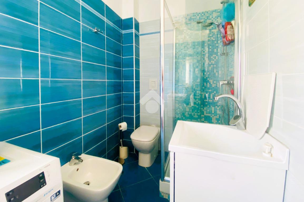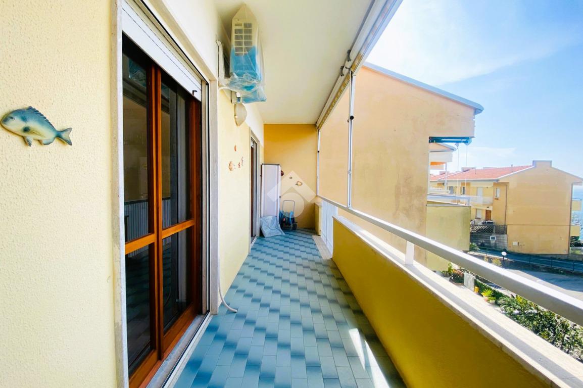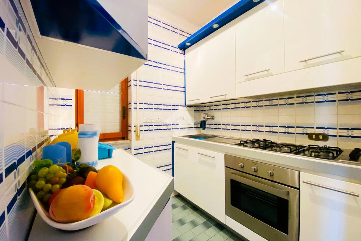 Internamente, la soluzione, in buono stato di manutenzione, ha una superficie totale di circa 67 mq ed è composta da: ingresso/disimpegno, due camere da letto, angolo cottura finestrato, soggiorno luminoso con accesso al balcone vista mare, bagno finestrato con doccia, doppio lavabo e attacco per lavatrice.
