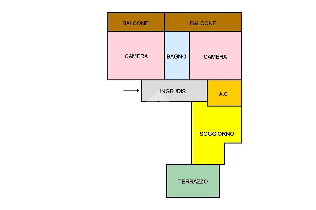L' appartamento, di circa 63 mq, è internamente ben rifinito ed è composto da ingresso/disimpegno, soggiorno con angolo cottura a vista e terrazzino spazioso esposto ad ovest e dotato di tenda da sole, bagno finestrato con doccia, due camere da letto, entrambe dotate di balconi esposti ad est.